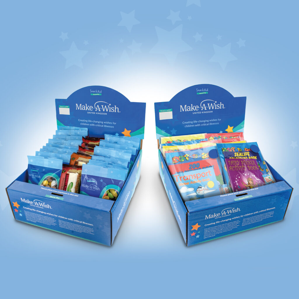 Make a Wish Charity Packaging for Sweet Products by Snack Aid. Snack and Activity pack franchise.